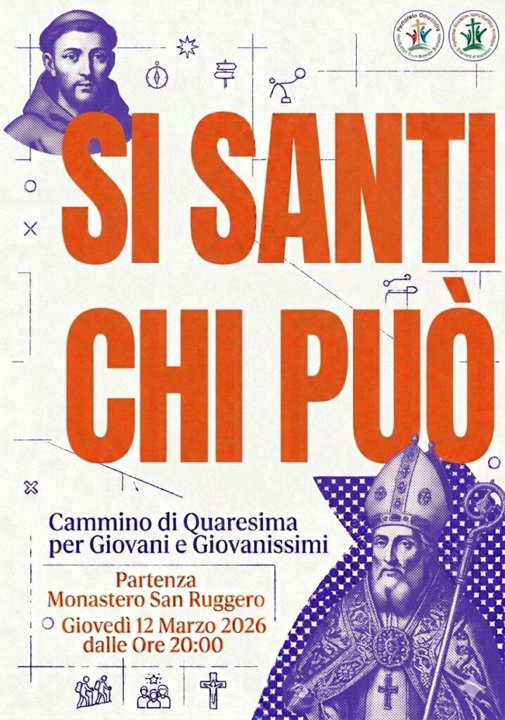 Giovedì 12 marzo,  a partire dalle ore 20:00, si terrà il cammino di preghiera e riflessione per giovani e giovanissimi della Zona Pastorale di Barletta “Si Santi chi può”. La “via della croce” di Gesù incontra le vite di S. Ruggiero e S. Francesco d’Assisi, e anche le vite di giovani in cammino sulla strada del Vangelo. Il percorso avrà inizio presso il Monastero di … Continua a leggere »