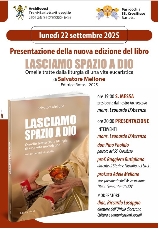 A BARLETTA LA PRESENTAZIONE DELLA NUOVA EDIZIONE DEL LIBRO LASCIAMO SPAZIO A DIO DI DON SALVATORE MELLONE Lunedì 22 settembre 2025, presso la parrocchia del SS. Crocifisso di Barletta, sarà presentata la nuova edizione del volume “Lasciamo spazio a Dio. Omelie tratte dalla liturgia di una vita eucaristica”, di don Salvatore Mellone, in occasione del decimo anniversario della sua morte, avvenuta il 29 giugno 2015, … Continua a leggere