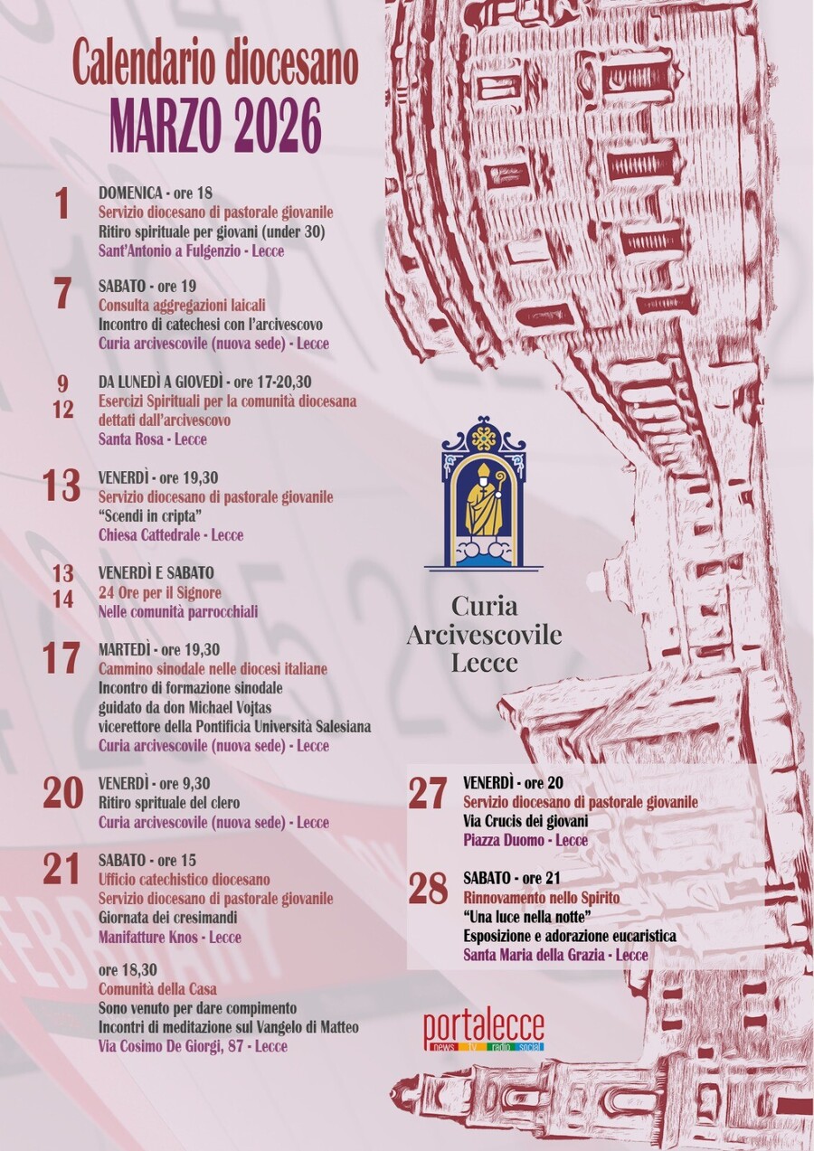 Chiudono il mese di marzo tre eventi: il 26 marzo l’incontro di spiritualità della Scuola diocesana di formazione teologica con l’arcivescovo alle 16,30 nella chiesa dei Santi Niccolò e Cataldo in Lecce; la Via Crucis dei giovani che si terrà venerdì 27 marzo alle 20 in Piazza Duomo e che è promossa dal Servizio diocesano di pastorale giovanile diocesana; e sabato 28 “Una Luce nella notte” a partire dalle 21 con la adorazione e la preghiera presso la chiesa di Santa Maria della Grazia in Piazza Sant’Oronzo.