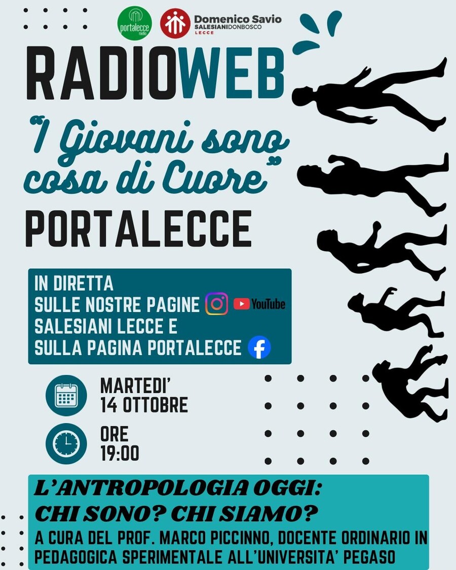 Un’occasione preziosa per dare voce ai sogni, alle sfide e alle riflessioni delle nuove generazioni seguendo sempre il messaggio di don Bosco. Il primo incontro del nuovo anno pastorale si terrà domani 14 ottobre alle 19 sulla pagina Fb di Portalecce (audio e video) e sul sito del quotidiano online (solo audio), con una puntata speciale dal titolo “L’antropologia oggi: Chi sono? Chi siamo?”.