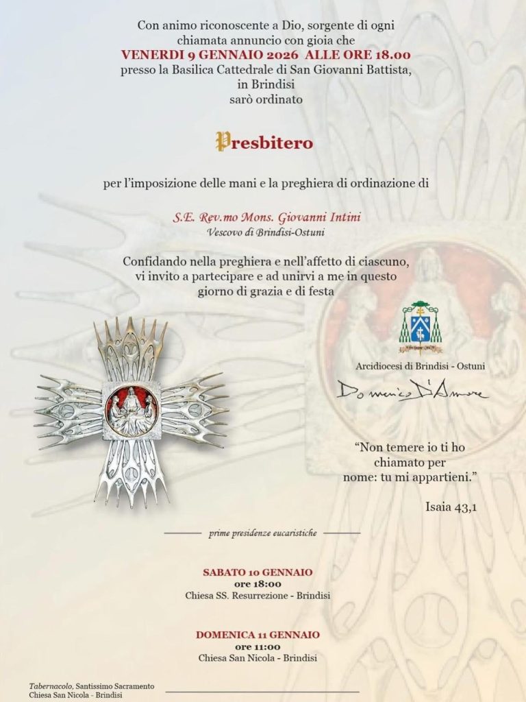 Con gioia condividiamo l’invito all’Ordinazione Presbiterale di don Domenico D’Amore, che si terrà venerdì 9 gennaio 2026, alle ore 18.00, presso la Basilica Cattedrale di San Giovanni Battista in Brindisi.
