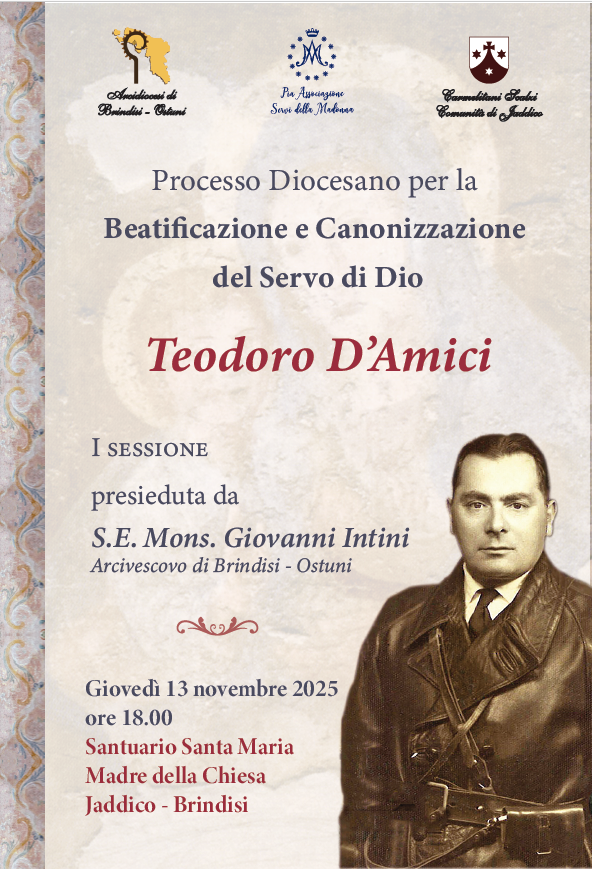 La comunità dei Carmelitani Scalzi di Jaddico e l’intera Arcidiocesi di Brindisi-Ostuni si preparano a vivere un momento di grazia e di grande significato ecclesiale: l’apertura ufficiale del processo diocesano per la beatificazione e canonizzazione del Servo di Dio Teodoro d’Amici.