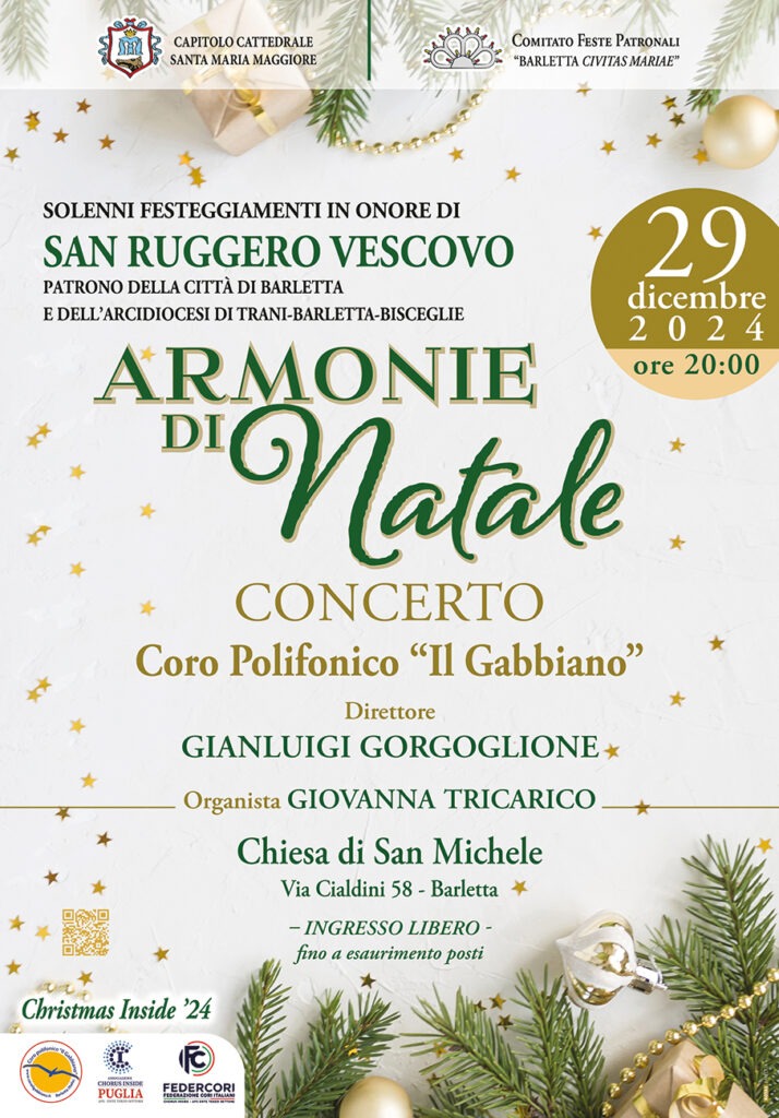 Nell’ambito dei solenni festeggiamenti in onore di San Ruggero Vescovo, patrono della città di Barletta e dell’Arcidiocesi di Trani-Barletta-Bisceglie, si terrà un suggestivo evento musicale dal titolo “Armonie di Natale”. L’appuntamento, previsto per il 29 dicembre 2024 alle ore 20:00, avrà luogo nella suggestiva cornice della Chiesa di San Michele, in via Cialdini 58 a Barletta. Protagonista della serata sarà il Coro Polifonico “Il … Continua a leggere