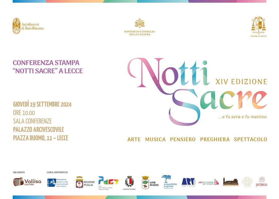 “Notti sacre”, in programma dal 21 settembre al 20 ottobre, è un evento di Vallisa Cultura realizzato in collaborazione con Arcidiocesi di Bari-Bitonto, Arcidiocesi di Lecce e ArtWork, con il sostegno del Ministero della Cultura attraverso il Fondo unico per la cultura, del patrocinio del Pontificio Consiglio della Cultura, Regione Puglia, Comune di Bari, Comune di Lecce, Acquedotto Pugliese, e del supporto di ArtEcclesiae Bari-Bitonto, Fondazione Splendor Fidei e Portalecce.