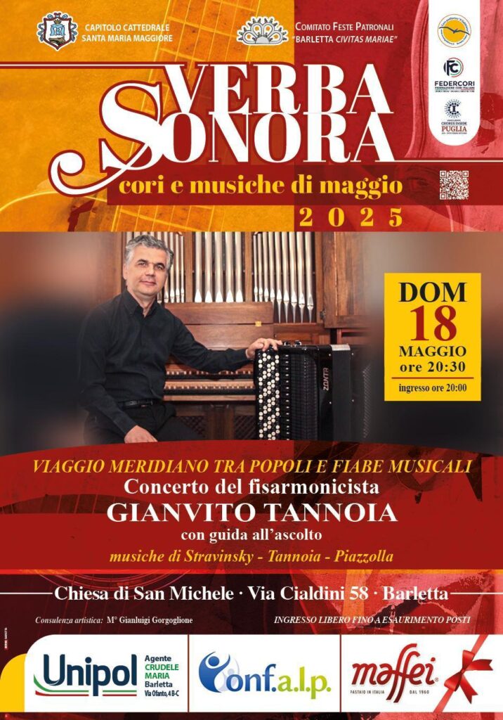 Domenica 18 maggio andrà in scena nella suggestiva cornice della chiesa di San Michele, luogo di incontro tra arte, fede e cultura, nel cuore del centro storico di Barletta, il secondo appuntamento della rassegna concertistica “Verba Sonora, cori e musiche di maggio” organizzata dal Comitato Feste Patronali “Barletta Civitas Mariae” e dal Capitolo Cattedrale Santa Maria Maggiore nell’ambito degli eventi culturali del mese Mariano … Continua a leggere »