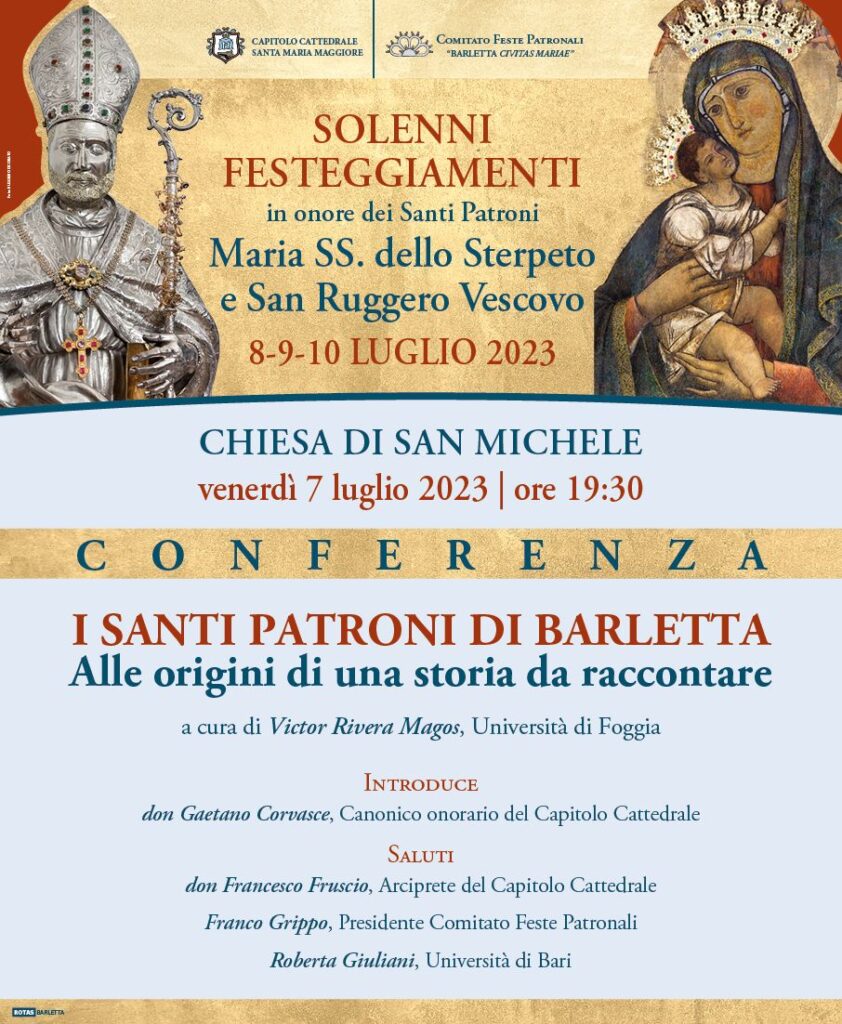 BARLETTA. CONFERENZA SU “I SANTI PATRONI DI BARLETTA. ALLE ORIGINI  DI UNA STORIA DA RACCONTARE” Venerdì 7 luglio 2023, a Barletta, presso la Chiesa di San Michele (Via Cialdini), alle ore 19.30, si terrà la conferenza sul tema “I Santi Patroni di Barletta. Alle origini di una storia da raccontare” a cura di Victor Rivera Magos, Università di Foggia Introduce: Don Gaetano Corvasce, Canonico onorario … Continua a leggere BARLETTA. CONFERENZA SU “I SANTI PATRONI DI BARLETTA. ALLE ORIGINI  DI UNA STORIA DA RACCONTARE” »