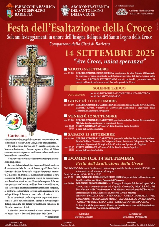 SABATO 6 SETTEMBRE ore 19.00, celebrazione eucaristica , da don Mauro Dibenedetto, parroco e padre spirituale dell’Arciconfraternita del Santo Legno della Croce, con il Rito di Vestizione di nuovi confratelli e presentazione novizi dell’Arciconfraternita del Santo Legno della Croce SOLENNE TRIDUO Ogni giorno ore 18.15, Intronizzazione della Stauroteca ore 18.30, Santo Rosario GIOVEDI 11 SETTEMBRE ore 19.00, Celebrazione eucaristica presieduta da Sua Ecc.za Rev.ma … Continua a leggere »
