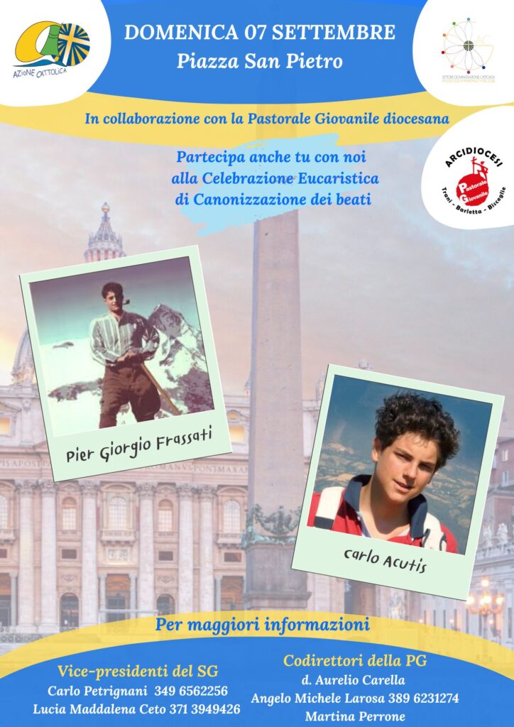 7 settembre Canonizzazione di Piergiorgio Frassati e Carlo Acutis La santità ci aspetta! Trasferta a cura del settore giovani di AC e della PG Diocesana Info dalla locandina o al link termine iscrizione 17 agosto   https://drive.google.com/drive/folders/1L4fAFlATucB1QrokvWBeB3aKXXoXKrdN