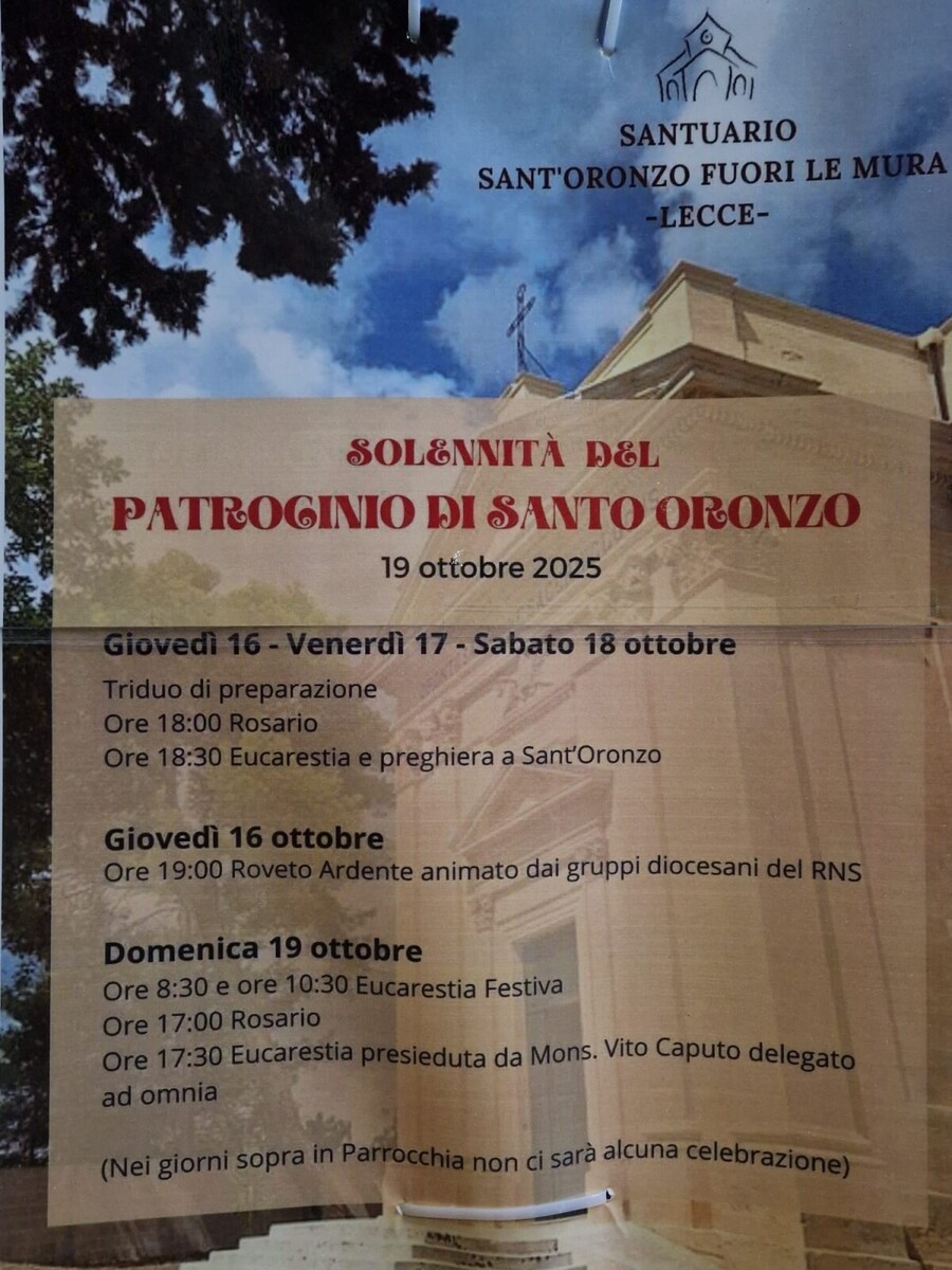 Alla luce di questa storia è davvero significativo come, anche quest’anno, già da giovedì 16 ottobre e fino a domenica 19, terza del mese, i leccesi possono nuovamente stringersi intorno al proprio santo. Recarsi in pellegrinaggio nel luogo che ha visto il martirio del nostro patrono è un atto di fede estremamente profondo perché ci riconnette alle radici più intime del nostro essere cristiani. La parrocchia Cuore Immacolato di Maria guidata da don Aldo Marzo e che ha in cura il santuario di Sant’Oronzo fuori le mura ha organizzato un triduo di preparazione che si concluderà domani sera con la messa presieduta da don Vito Caputo, delegato arcivescovile ad omnia (IL PROGRAMMA SOTTO).