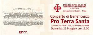 Domenica 25 maggio, alle ore 18:00, nella Chiesa di S. Maria delle Grazie alle Cammarelle, si svolgerà un concerto di beneficenza per la Terra Santa. All’evento, organizzato dalla delegazione di Lucera-Troia dell’Ordine Equestre del Santo Sepolcro di Gerusalemme, saranno presenti S.E.R. Mons. Giuseppe Giuliano e S. E. Cav. Gr. Cr. Prof. Notaio Ferdinando Parente, Luogotenente per l’Italia Meridionale Adriatica dell’O.E.S.S.G.