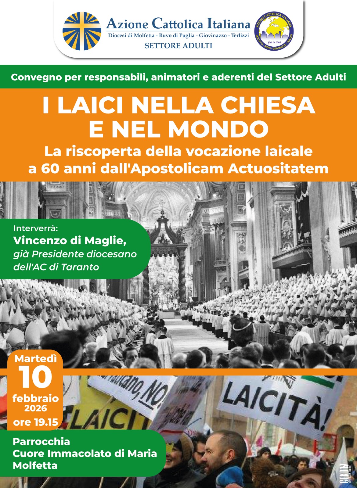 A 60 anni da quel momento storico, ci chiediamo: come viviamo oggi questa vocazione e come può crescere nel futuro della Chiesa e del mondo? Questi gli spunti di riflessione che saranno affrontati al convegno diocesano promosso dal Settore Adulti dell’Azione Cattolica diocesana sul tema: “I laici nella chiesa e nel mondo. La riscoperta della vocazione laicale a 60 anni dall’Apostolicam Actuositatem” che si svolgerà martedì 10 febbraio 2026 alle ore 19.15 presso la parrocchia Cuore Immacolato di Maria a Molfetta.