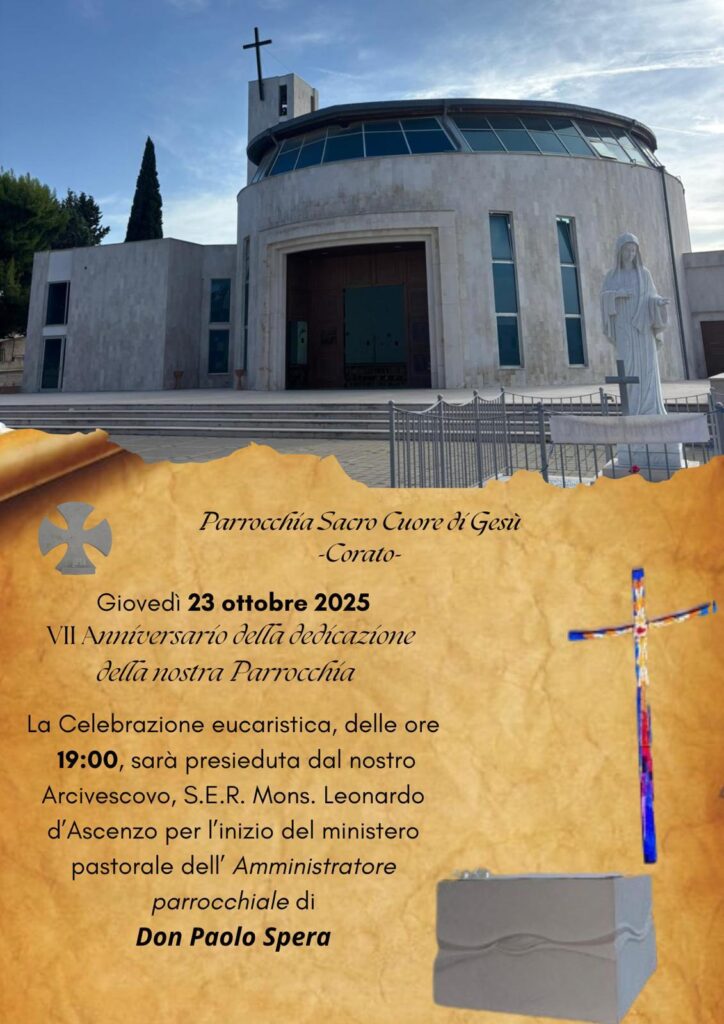 Giovedì 23 ottobre 2025, a Corato, nella parrocchia Sacro Cuore di Gesù, alle ore 19.00, durante la celebrazione eucaristica presieduta dall’Arcivescovo mons. Leonardo D’Ascenzo, don Paolo Spera inizierà il suo ministero di amministratore parrocchiale, succedendo a don Vito Martinelli. Don Paolo è nato a Trani il 12 gennaio 1994 e proviene dalla parrocchia Sacro Cuore di Gesù in San Ferdinando di Puglia. Ha conseguito … Continua a leggere