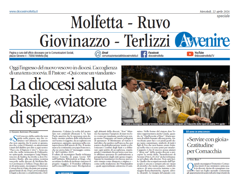La diocesi di Molfetta-Ruvo-Giovinazzo-Terlizzi vive un momento di particolare grazia con l’ingresso del nuovo Vescovo, mons. Domenico Basile, chiamato a guidare la comunità diocesana come “viatore di speranza”.
