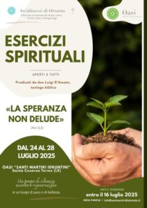 Nel cuore della prossima estate, una proposta di spiritualità per tutti da parte dell’Oasi “Santi Martiri Idruntini” e dell’Ufficio per la pastorale del tempo libero, turismo, sport e pellegrinaggi della nostra Arcidiocesi: “La speranza non delude” (Rm 5,5), un corso di esercizi spirituali che si terrà dal 24 al 28 luglio p.v. a Santa Cesarea Terme.