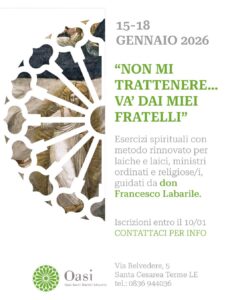 - Nel mese di gennaio 2026, da giovedì 15 a domenica 18, si terrà un corso di esercizi spirituali aperto a tutti e guidato da don Francesco Labarile, presbitero della Diocesi di Campobasso Bojano.
