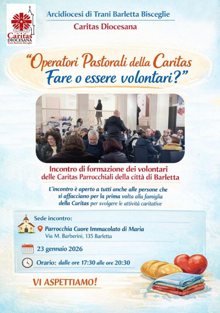 Prosegue il cammino di formazione promosso dalla Caritas Diocesana dell’Arcidiocesi di Trani-Barletta-Bisceglie con un nuovo appuntamento dedicato agli operatori pastorali della carità. Al centro dell’incontro, dal titolo “Fare o essere volontari?”, vi è una riflessione sul senso profondo del volontariato, inteso non solo come insieme di attività operative, ma come scelta di vita ispirata alla relazione, alla prossimità e alla carità evangelica. L’iniziativa è rivolta … Continua a leggere