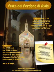 Le sorelle Clarisse del Monastero di Otranto hanno programmato il primo agosto alle ore 21.00 la Liturgia penitenziale presieduta da Mons. Francesco Neri; il 2 agosto alle 7.15 le Lodi e alle 8.00 la Santa Messa, sempre presieduta da Mons. Francesco Neri; per concludere alle ore 18.30 i Vespri.