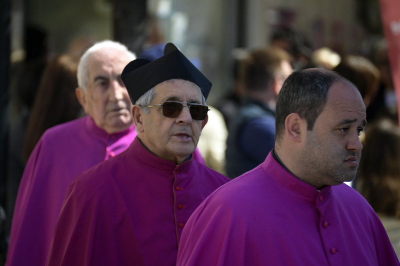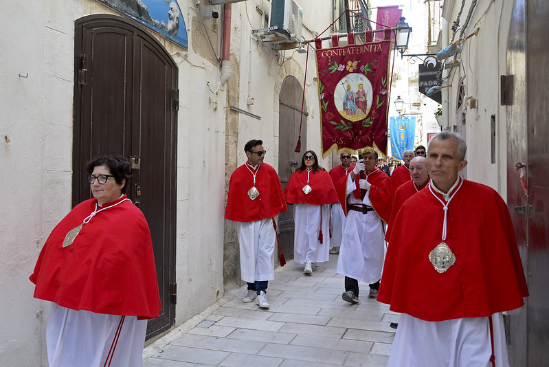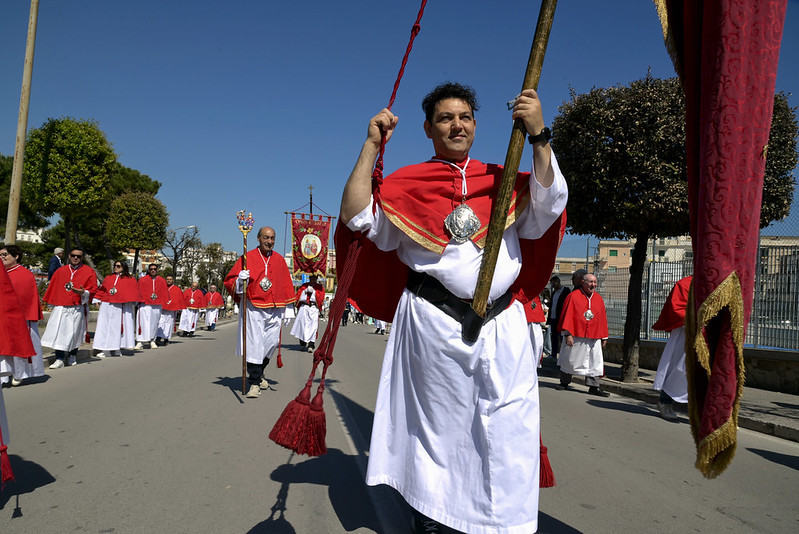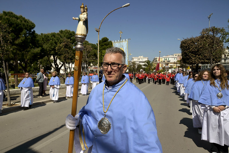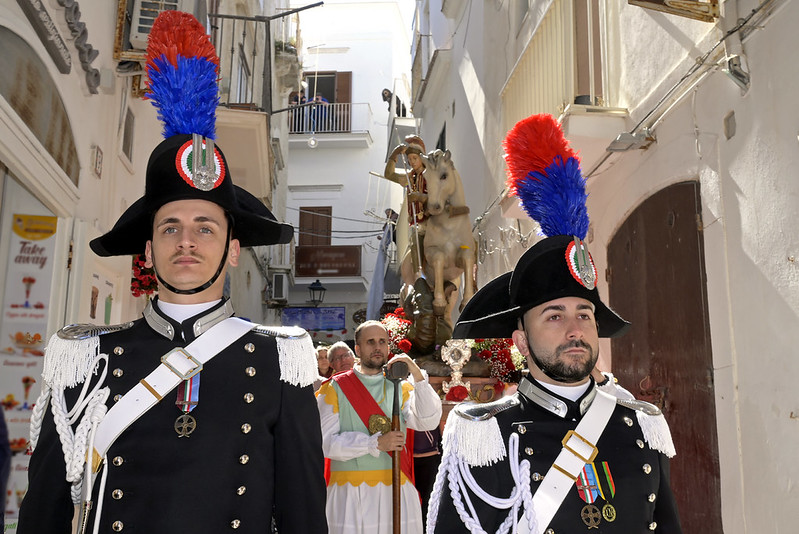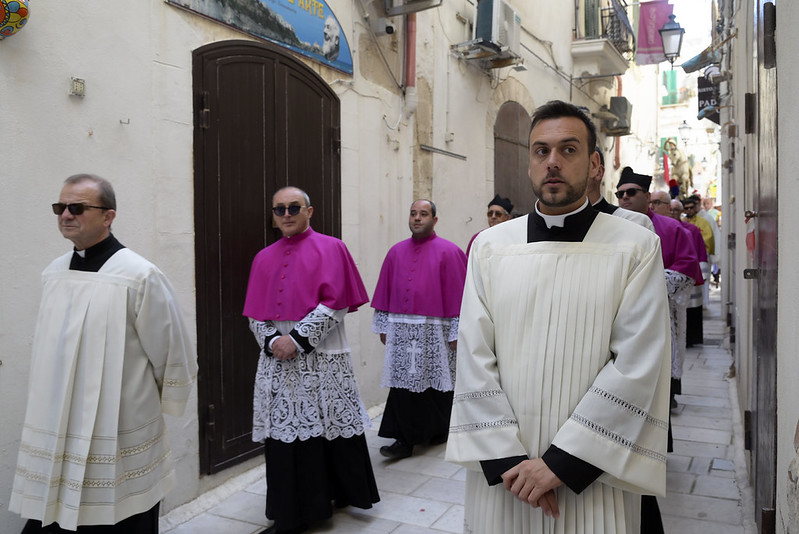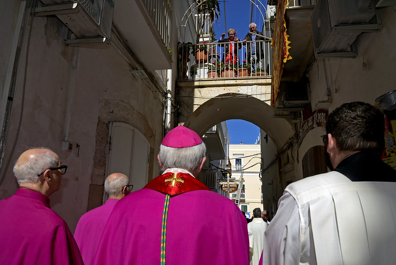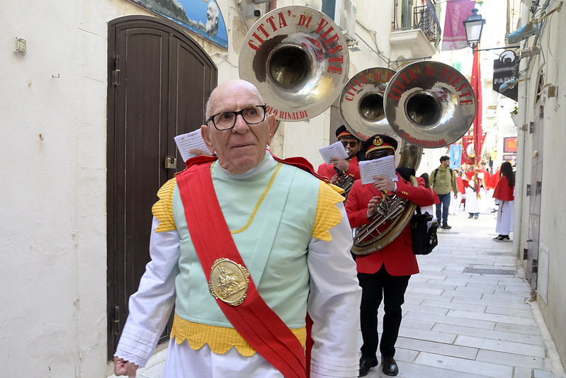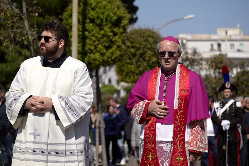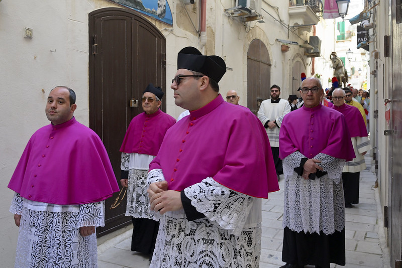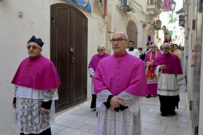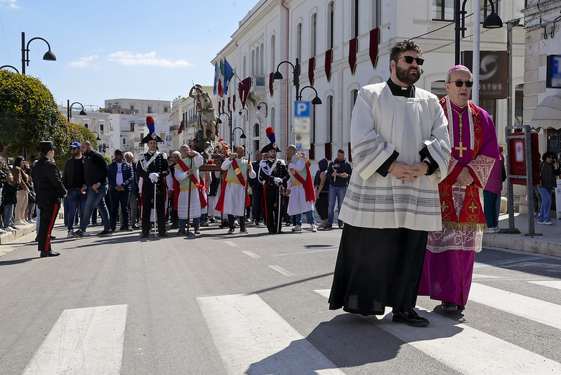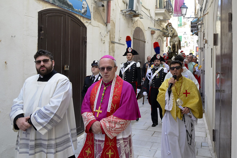 Saluto il signor Sindaco, l’Amministrazione, l’Assessora regionale, le autorità civili e militari presenti, i miei confratelli nel sacerdozio della città di Vieste e vorrei anche aggiungere un saluto particolare al piccolo gruppo del consiglio comunale dei ragazzi, con il mini sindaco e gli altri ruoli; che non è, poi, proprio così fuori posto nelle feste patronali e in modo particolare nella festa patronale di San Giorgio, perché al di là di come viene rappresentato (secondo un’immagine che proviene dalla tradizione e dall’antico mondo dell’impero romano, perché San Giorgio è un santo del terzo secolo, della fine del terzo secolo dell’era cristiana, quindi è vestito secondo il costume di allora), la sua funzione è stata una funzione civile e militare al contempo (allora la distinzione tra le autorità civili e militari non era così chiara come è oggi, allora erano un po’ mescolate), ma erano funzioni di servizio al bene pubblico e civile prima ancora che essere una funzione militare di difesa e di protezione. Ecco quindi – in qualche modo – San Giorgio può essere colto come immagine ecco di un buon amministratore, di un buon servo della propria cittadinanza e della società e quindi essere, ancora oggi, punto di riferimento civile nel servizio alla società; oltre che al fatto di essere tra i primi cristiani e quindi discepolo del Signore, suo imitatore e alla fine suo testimone nel martirio.