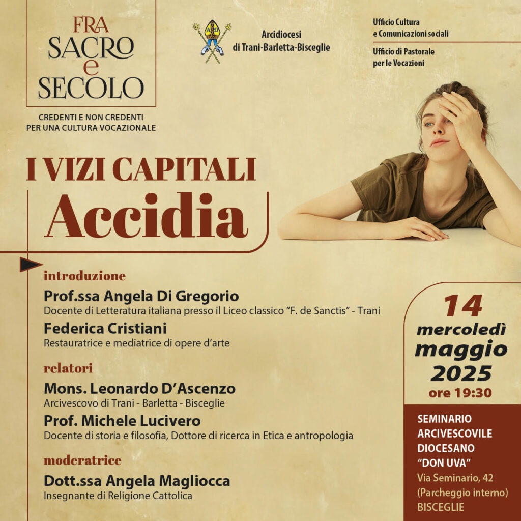 Mercoledì 14 maggio 2025, alle ore 19.30, presso il Seminario Arcivescovile Diocesano “Don Uva” di Bisceglie, si terrà un incontro dedicato al tema dell’ “accidia”, nell’ambito della rassegna “Fra Sacro e Secolo” , quest’anno dedicata ai “sette vizi capitali”, promosso dall’Arcidiocesi di Trani-Barletta-Bisceglie. L’iniziativa, intende offrire una riflessione profonda sulla cultura vocazionale attraverso l’analisi di temi di grande rilevanza spirituale ed esistenziale. L’introduzione sarà affidata … Continua a leggere