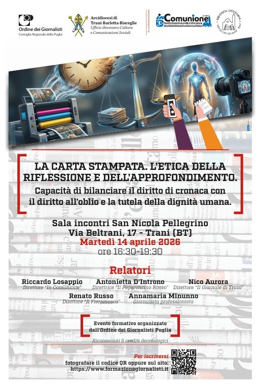 GIORNALISMO E DEONTOLOGIA. A TRANI UN INCONTRO SUL VALORE DELLA CARTA STAMPATA L’evento, promosso dall’Ufficio Cultura e Comunicazioni Sociali dell’Arcidiocesi di Trani, si terrà il 14 aprile presso la Sala incontri San Nicola Pellegrino 17 per discutere di etica professionale. E’ stato accreditato dall’Ordine Giornalisti Puglia con 5 crediti deontologici. In un panorama informativo segnato dalla velocità del digitale e dal fenomeno dell’infodemia, l’approfondimento giornalistico … Continua a leggere