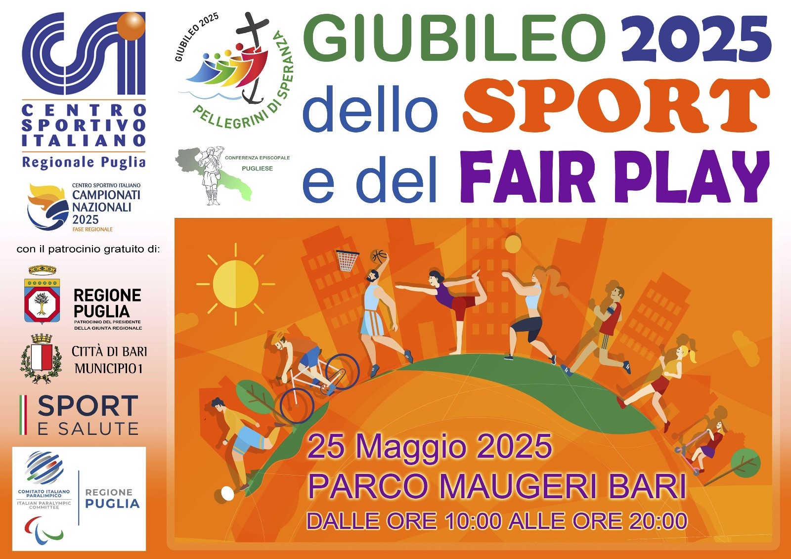 Domenica 25 maggio 2025, per mandato dalla Conferenza Episcopale Pugliese (C.E.P.) il CSI Puglia organizza una giornata di fraternità per crescere nelle dimensioni del dialogo, della corresponsabilità su questioni centrali come la Pace e il Servizio reciproco, sulla base di solidi valori sportivi come amicizia, lealtà, tenacia, spirito di gruppo, sacrificio, rispetto, solidarietà, inclusione, speranza.
