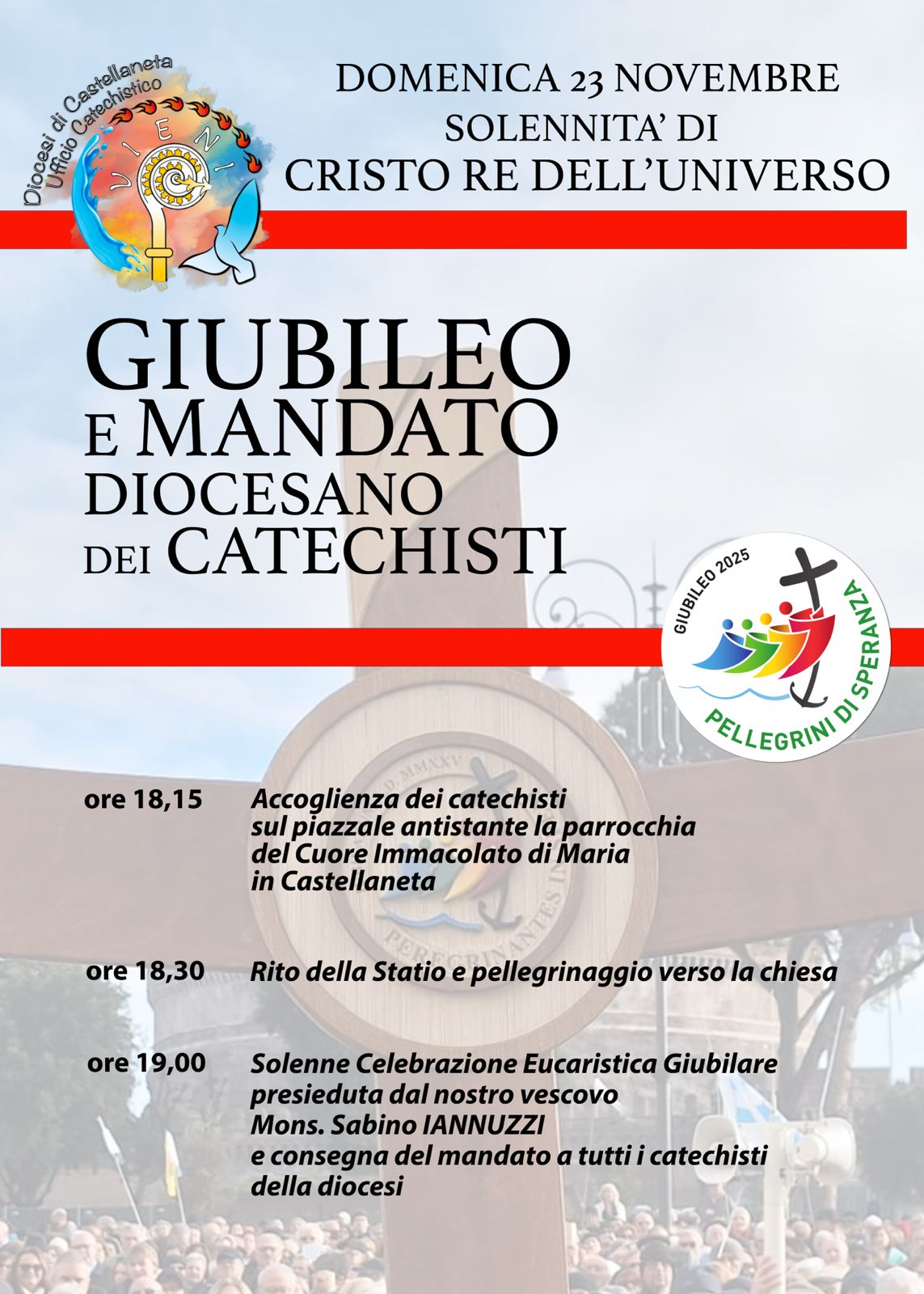 Domenica 23 Novembre 2025, Solennità di Cristo Re dell’Universo, i catechisti vivranno l’evento giubilare loro dedicato presso la Parrocchia Cuore Immacolato di Maria in Castellaneta. Durante la Celebrazione Eucaristica Mons. Sabino Iannuzzi consegnerà il mandato a tutti i catechisti.