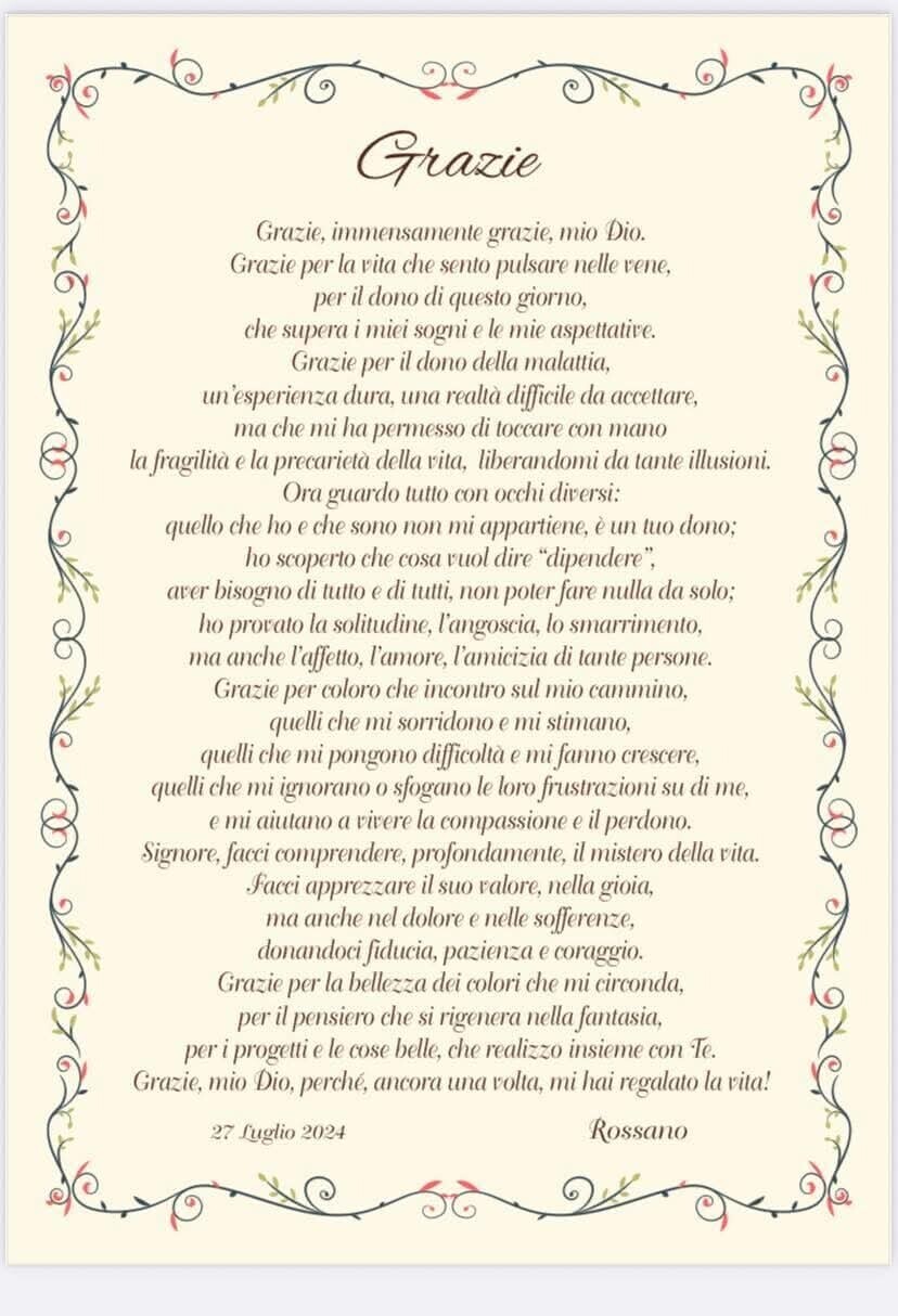 E, come un sigillo, la gratitudine che abbraccia ogni cosa: “Grazie per la bellezza dei colori che mi circonda, per il pensiero che si rigenera nella fantasia, per i progetti e le cose belle, che realizzo insieme con Te. Grazie, mio Dio, perché, ancora una volta, mi hai regalato la vita!”. Parole semplici e potenti che oggi risuonano come un lascito prezioso per chi ha conosciuto don Rossano, per chi continuerà a leggere le sue preghiere e seguire il suo esempio di vita.