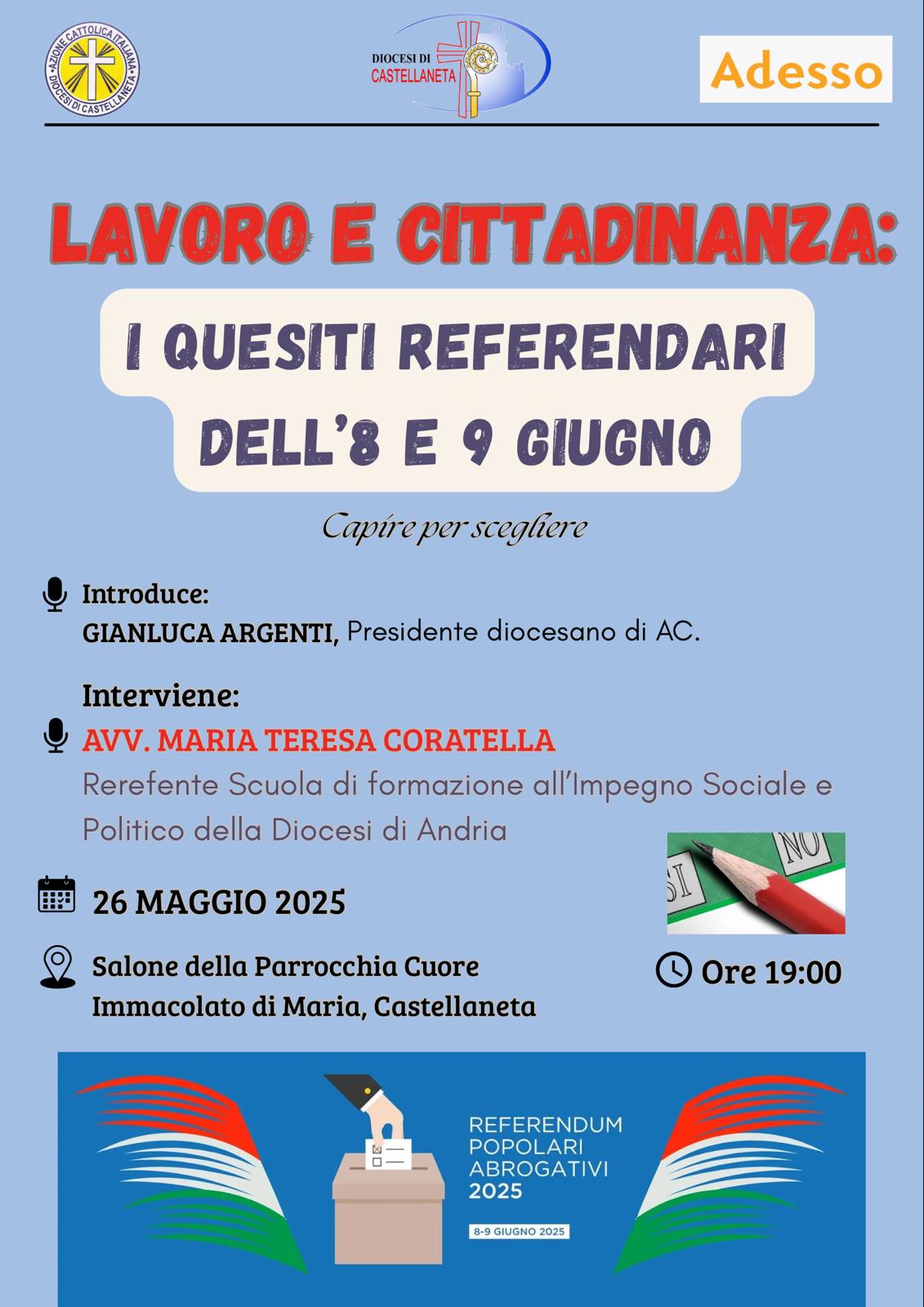 Lunedì 26 Maggio alle ore 19:00 presso il Salone della Parrocchia Cuore Immacolato di Maria di Castellaneta l’Azione Cattolica diocesana invita tutti a un momento di approfondimento e confronto aperto sul prossimo referendum: un’occasione per informarsi, riflettere insieme e compiere una scelta consapevole. Interverrà l’Avv. Maria Teresa Coratella, Referente Scuola di formazione all’Impegno Sociale Politico della Diocesi di Andria.