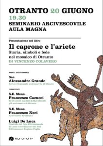 L’Aula magna del Seminario Arcivescovile a Otranto, il 20 giugno p.v. alle ore 19.30, ospiterà la presentazione del libro “Il caprone e l’ariete. Storia, simboli e fede nel mosaico di Otranto” di Vincenzo Colavero.
