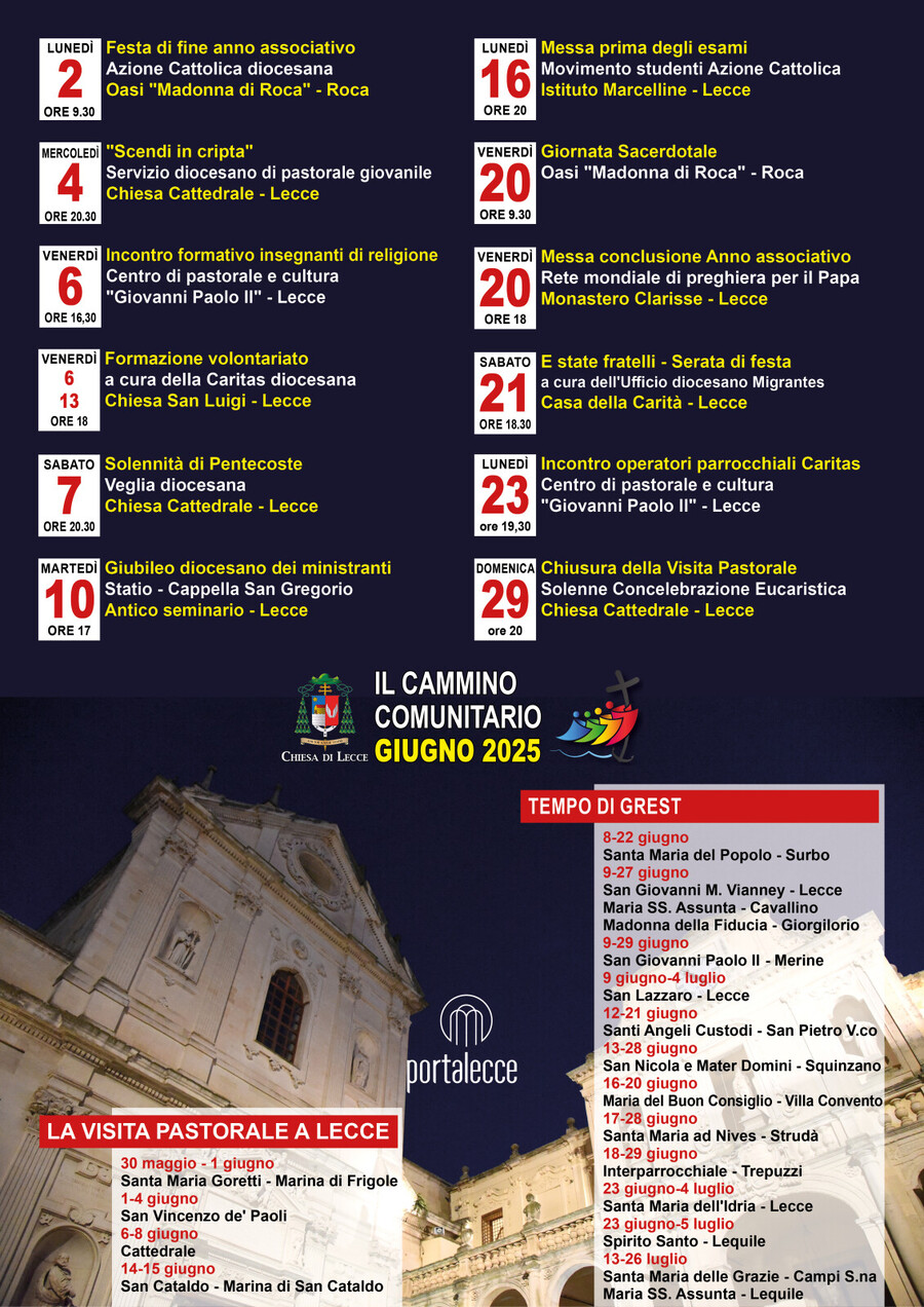 Tante le iniziative che animeranno anche il mese di giugno. Lunedì 2 giugno, come da antica tradizione, con inizio alle 9.30, l’Azione cattolica diocesana vivrà a Roca, presso l’Oasi Madonna di Roca, la festa di fine anno associativo; mercoledì 4 giugno alle 20.30 si terrà, invece, l’ultimo appuntamento del ciclo “Scendi in Cripta” promosso dal Servizio diocesano di pastorale giovanile.