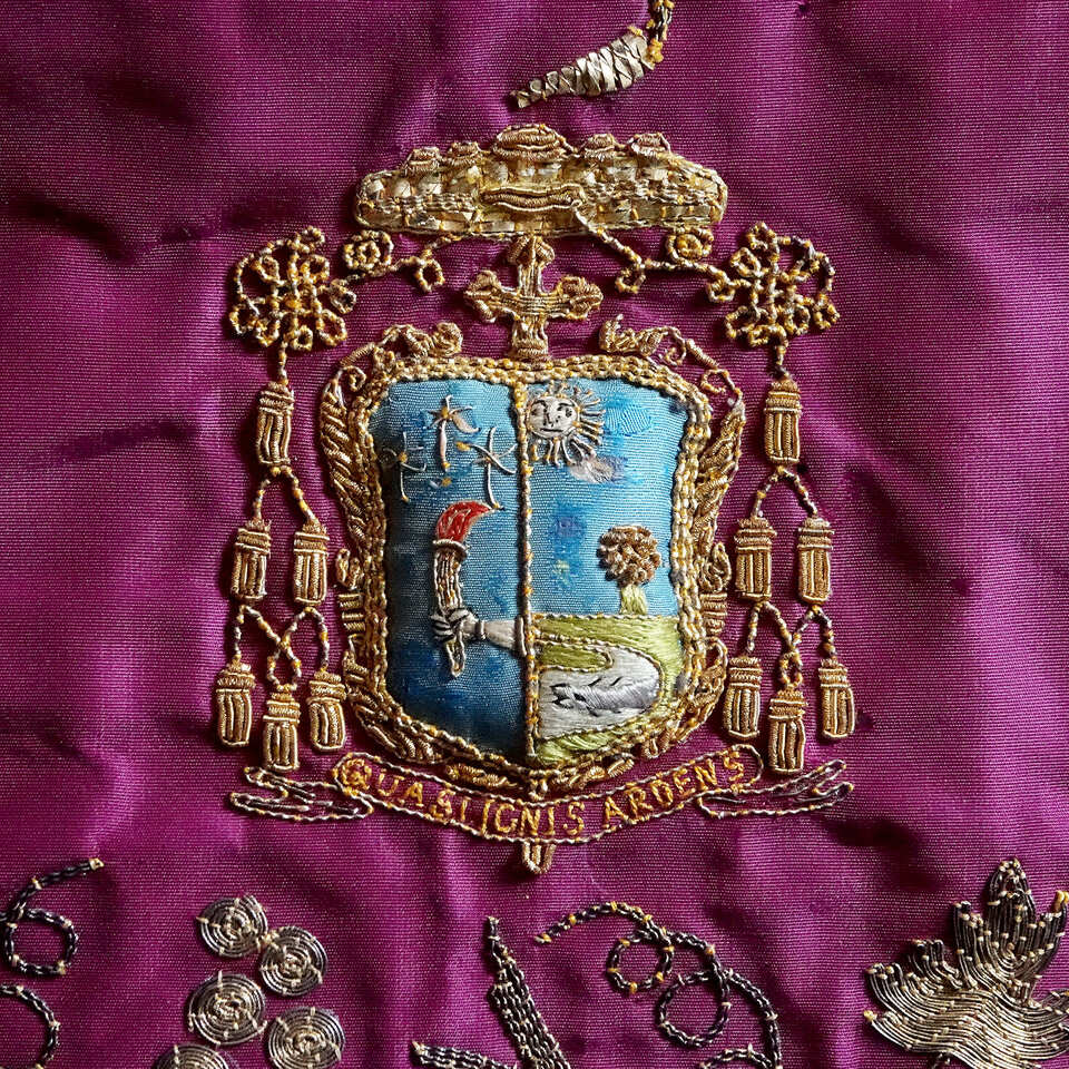 L’attribuzione al presule neritino è comprovata dallo stemma vescovile finemente ricamato sul retro della pianeta, accompagnato dal motto episcopale quasi ignis ardens. Lo stemma risulta infatti: diviso in due parti, nella prima d’azzurro al sinistrocherio d’oro con la fiaccola dello stesso, caricata di tre comete a sei raggi d’oro male ordinate; nel secondo al naturale, con il pino nutrito sulla pianura erbosa, fiancheggiante il lago con pesci al naturale, e il sole d’oro uscente dall’angolo superiore destro. Un complesso araldico di grande raffinatezza, che unisce simbologia spirituale e identità personale, reso con una perizia tecnica di notevole pregio.