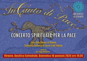 Il Coro della Diocesi di Otranto, accompagnato dall’Orchestra di Lecce e del Salento, è lieto di invitare la comunità diocesana a un momento di elevazione spirituale e di preghiera attraverso la musica e il canto. Il 18 gennaio prossimo, alle ore 19.00, nella Basilica Cattedrale avrà luogo “InCanto di pace”.