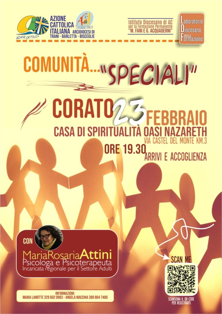 Secondo appuntamento del Laboratorio Diocesano della Formazione del Settore Adulti di Azione Cattolica Il Settore Adulti dell’Azione Cattolica diocesana organizza il secondo appuntamento del Laboratorio Diocesano della Formazione, che si terrà lunedì 23 febbraio alle ore 19:30 presso la Casa di Spiritualità Oasi di Nazareth, a Corato. È possibile partecipare all’iniziativa compilando il modulo al seguente link:   https://forms.gle/96SFg412DGM7YmFz9   L’incontro si aprirà con … Continua a leggere »