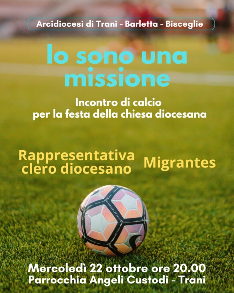 Nell’ambito della festa della Chiesa diocesana, l’Arcidiocesi di Trani-Barletta-Bisceglie propone un momento di fraternità e sport con l’incontro di calcio dal titolo “Io sono una missione”. L’iniziativa, che si svolgerà mercoledì 22 ottobre alle ore 20.00 presso la Parrocchia Angeli Custodi di Trani, vedrà scendere in campo la rappresentativa del clero diocesano e la squadra dei Migrantes. L’appuntamento vuole essere un segno concreto di comunione … Continua a leggere