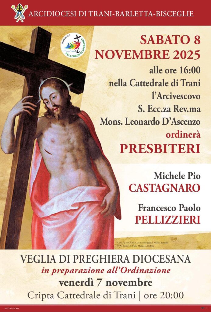 Sabato 8 novembre 2025, a Trani, nella Cattedrale, alle ore 16.00, durante una solenne celebrazione eucaristica presieduta dall’Arcivescovo mons. Leonardo D’Ascenzo, i diaconi Michele Pio Castagnaro e Francesco Paolo Pellizzieri saranno ordinati presbiteri. La celebrazione eucaristica sarà trasmessa in diretta televisiva su Easy Tv, canale 81. In preparazione all’ordinazione presbiterale, venerdì 7 novembre, nella Cripta della Cattedrale di Trani, allo ore 20.00, si terrà una … Continua a leggere