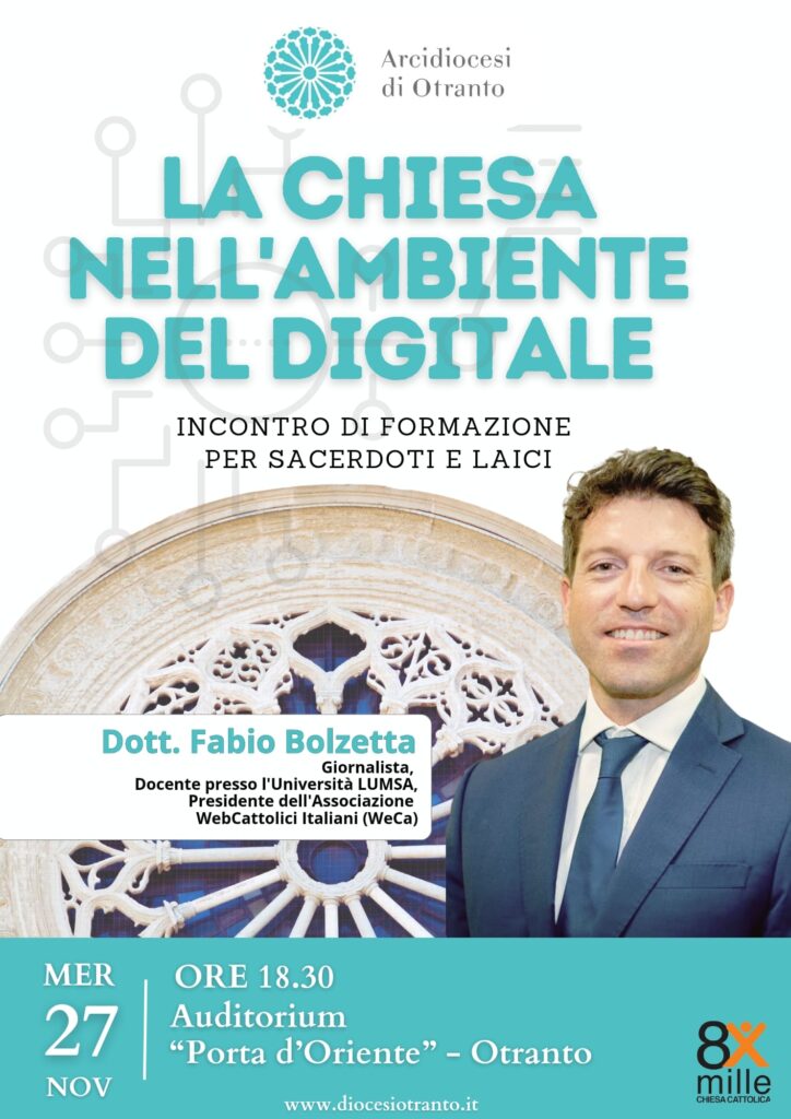 Nella cultura contemporanea, la comunicazione svolge un ruolo caratterizzante. In questa prospettiva la comunità otrantina si interroga giorno 27 novembre p.v. alle ore 18.30 presso l’Auditorium “Porta d’Oriente” in Otranto in un incontro con il Dott. Fabio Bolzetta, Giornalista e Docente presso l’Università LUMSA, Presidente dell’Associazione WebCattolici Italiani (WeCa).