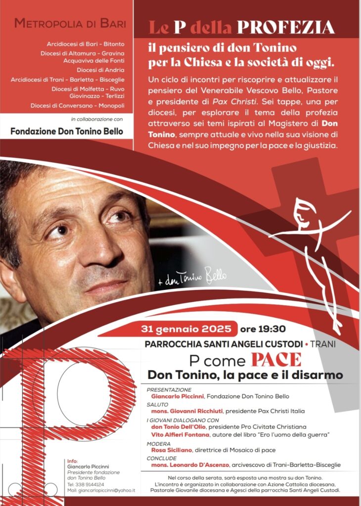 LA “P” COME PACE: DON TONINO, LA PACE E IL DISARMO Il 31 gennaio 2025, presso la Parrocchia Santi Angeli Custodi di Trani, si terrà un incontro dal titolo “P come Pace: Don Tonino, la pace e il disarmo”, alle 19.30 E’ la prima di sei tappe del ciclo di appuntamenti Le P della Profezia. L’iniziativa, promossa dalla Metropolia di Bari in collaborazione … Continua a leggere