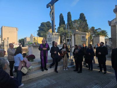 I giovani leccesi, guidati da don Alessandro Giglio, catechista itinerante del Cammino neocatecumenale nel Salento, insieme a Rino e Cristina Petruzzelli e al seminarista Alessandro, hanno compiuto un pellegrinaggio tra le tombe dei fedeli defunti prima della celebrazione eucaristica presieduta dall’arcivescovo Angelo Raffaele Panzetta, sul piazzale antistante la chiesa dei Santi Niccolò e Cataldo.