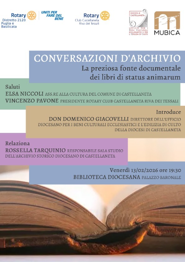 Venerdì 13 Febbraio 2026 alle ore 19:30 presso la Biblioteca diocesana sita nel Palazzo Baronale di Castellaneta l’Ufficio diocesano per i Beni Culturali Ecclesiastici organizza un incontro dal titolo “Conversazioni d’archivio: la preziosa fonte documentale dei libri di status animarum”.