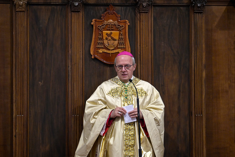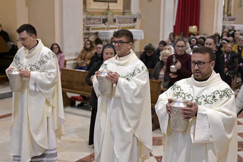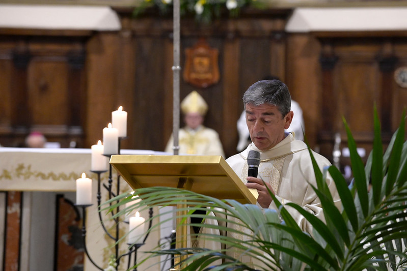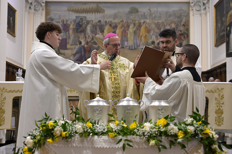 E poi questo grazie lo voglio dire in modo particolare al confratello nell’episcopato, monsignor Domenico, ad ognuno dei sacerdoti presenti, tanto del Presbiterio diocesano che delle diverse istituzioni religiose che abbelliscono la nostra Diocesi. Dico grazie per questi sette abbondanti anni trascorsi con voi e lo dico in modo particolare anche per il testo di Vangelo che ci è consegnato nella Messa Crismale e che a me è particolarmente caro perché è il Vangelo della domenica in cui iniziai con voi il percorso di pastore di questa Diocesi sipontina. Quindi grazie a ognuno e a tutti.
