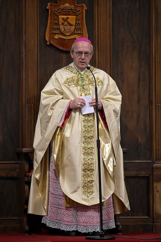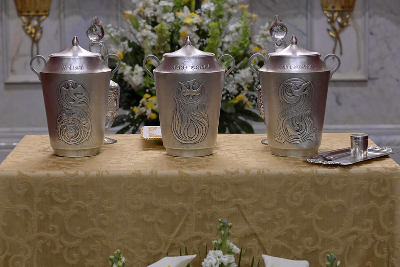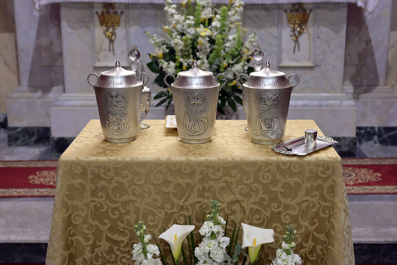 La prima la prendo dallo sguardo. Il testo di Giovanni della manifestazione del Risorto utilizza tre verbi diversi in greco per dire guardare e vedere. C’è il verbo “θεωρέω” che è lo sguardo arricchito dalla riflessione; non è ancora lo sguardo della fede ma è già un passaggio rispetto al semplice osservare e vedere. E la parola che prendo dallo sguardo di questa sera è la parola bellezza: può sembrare strano ma è così. Dalla esperienza di questi anni devo dire che la Messa Crismale è la più bella di tutte, perché è quella che rappresenta la totalità della nostra Chiesa e ne rappresenta la sinodalità che abbiamo a lungo per anni cercato di approfondire.