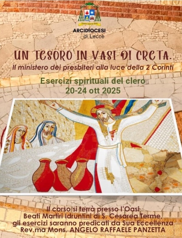 Dal 20 al 24 ottobre prossimi, dunque, un nutrito gruppo di preti insieme con il pastore, si trasferiranno a Santa Cesarea Terme presso l’Oasi “Santi Martiri Idruntini”: lasceranno per qualche giorno i consueti luoghi e obblighi del loro servizio sacerdotale per dedicarsi alla preghiera, all’ascolto e alla meditazione. A guidare il percorso spirituale sarà lo stesso arcivescovo che tratterà il tema “Un tesoro in vasi di creta. Il ministro dei presbiteri alla luce della 2a Corinti“.