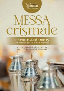 Mercoledì 1 aprile si terrà alle ore 19.00 presso la Cattedrale di Andria la Messa Crismale presieduta dal nostro Vescovo, con la benedizione degli olii santi e il rinnovo delle promesse sacerdotali. Tutta la comunità diocesana è invitata.