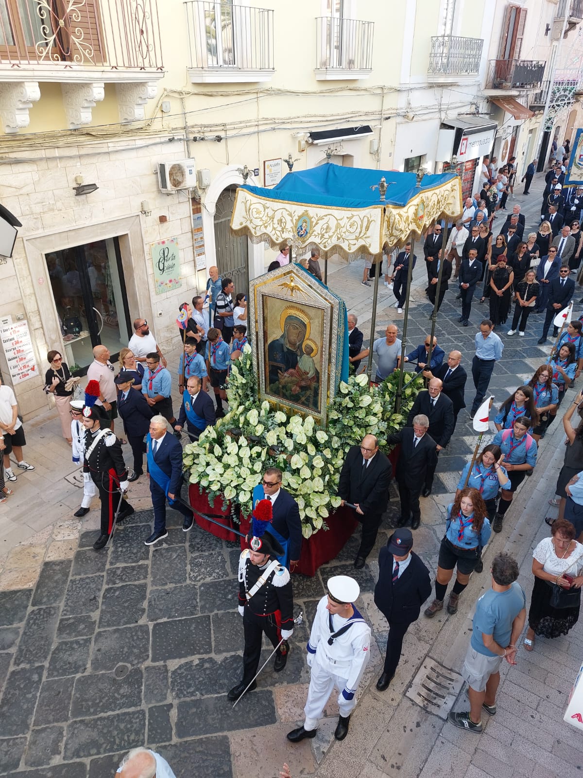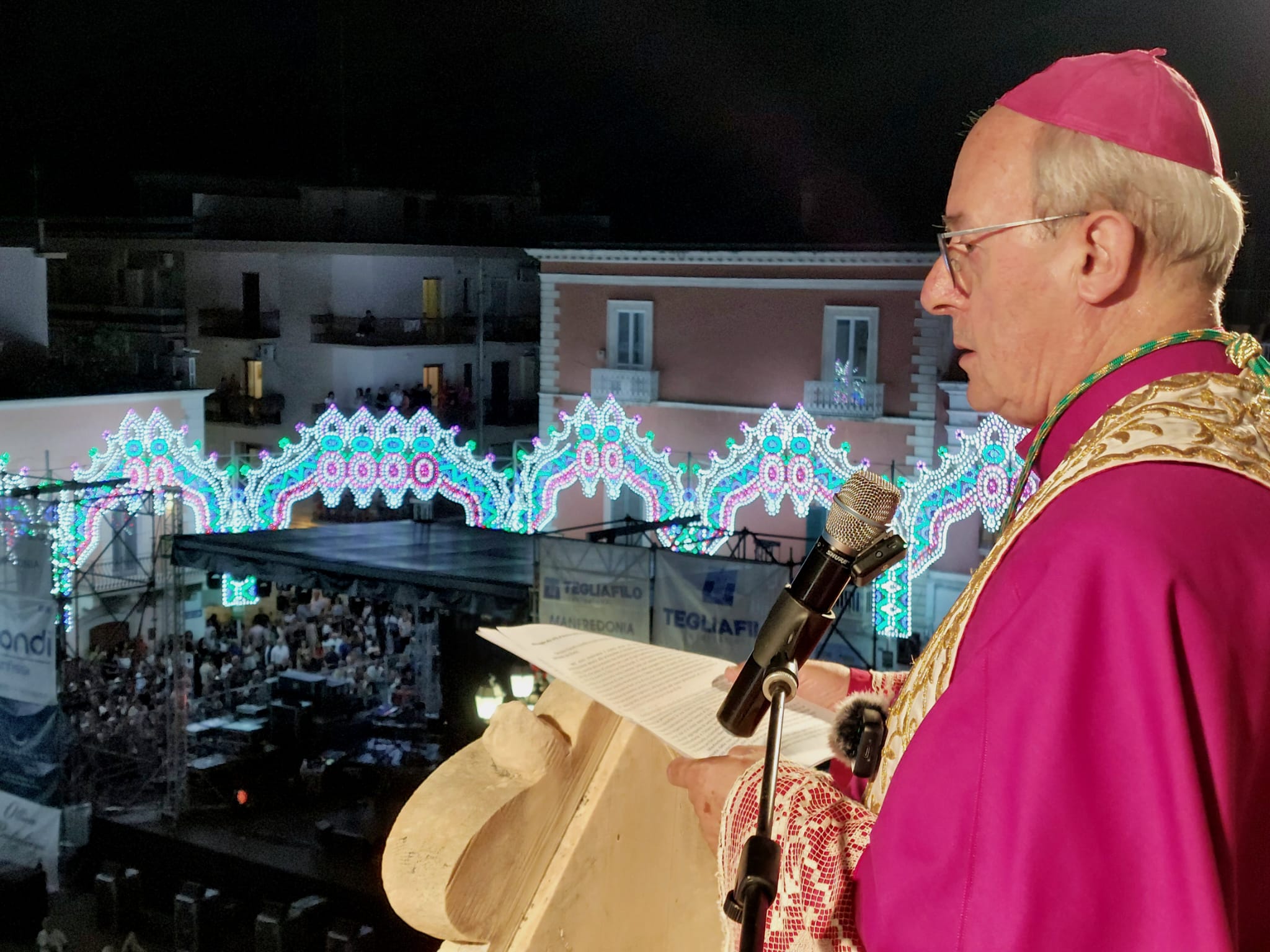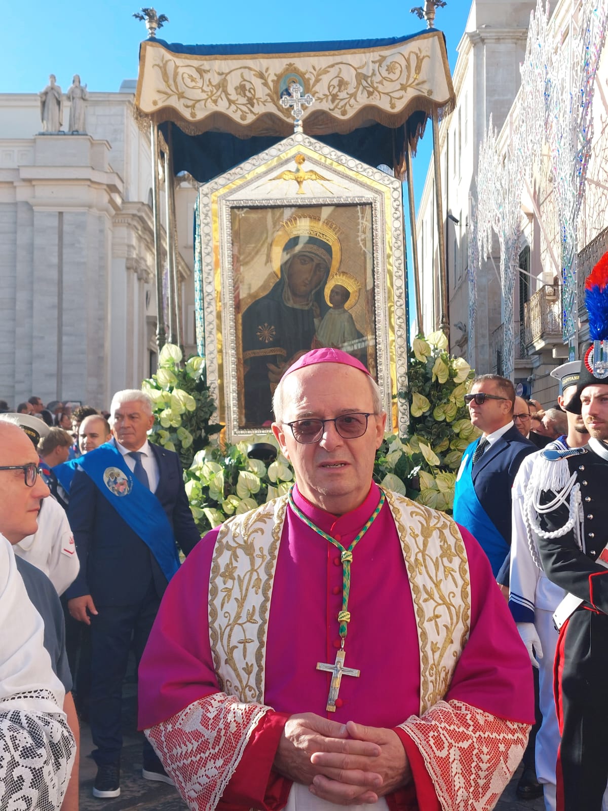 ogni anno rinnoviamo il nostro amore alla Regina di Siponto con la partecipazione devota alla processione e riempiamo, come popolo coeso e da Lei riunito, questa piazza duomo che costituisce il cuore pulsante della Città. E’ un cuore grande, che pulsa all’unisono con i cuori di ogni manfredoniano e manfredoniana che vive e fa vivere la Città e la Chiesa locale. E’ mio dovere riconoscere questa verità ed aiutarvi a rinnovarla nella coesione civile, nel solidale impegno per il bene comune, nella tradizione di fede cristiana e di valori evangelici che ormai da quasi due millenni innervano Siponto-Manfredonia e l’intero Gargano. Di questi valori civili e cristiani dobbiamo esserne fieri, e su di essi, non su altre motivazioni fuorviate da false e facili tentazioni di indebito profitto, dobbiamo continuare a progettare e costruire il futuro per consegnarlo migliore e più giusto alle nuove generazioni ed a chi custodirà la Chiesa, la Città e l’amato Gargano dopo di noi.