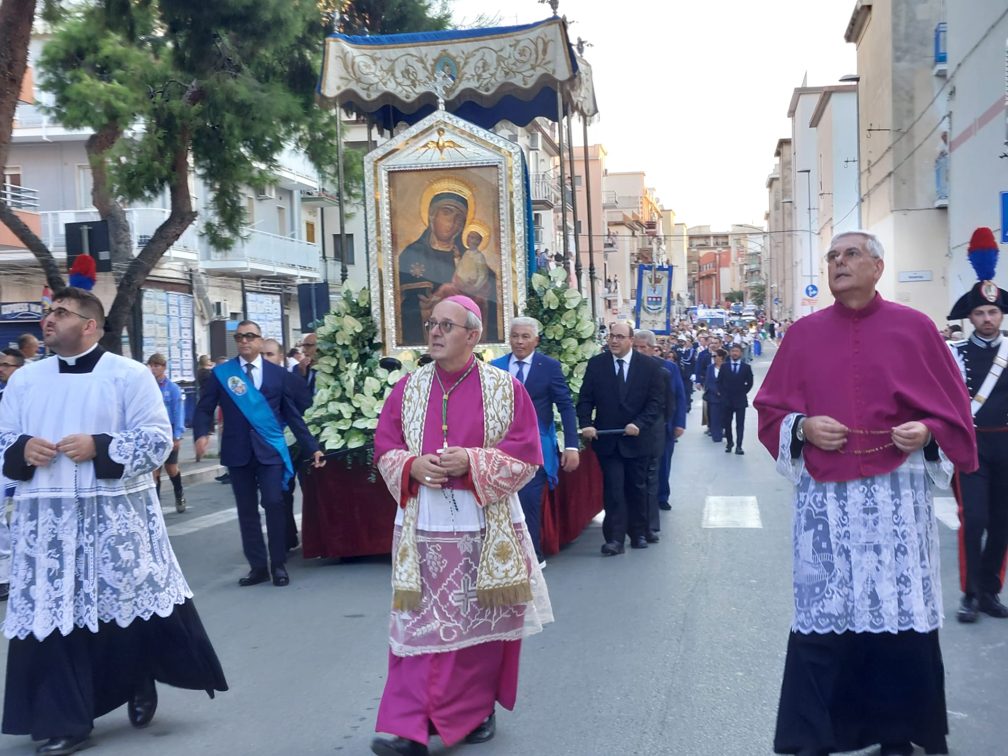 ogni anno rinnoviamo il nostro amore alla Regina di Siponto con la partecipazione devota alla processione e riempiamo, come popolo coeso e da Lei riunito, questa piazza duomo che costituisce il cuore pulsante della Città. E’ un cuore grande, che pulsa all’unisono con i cuori di ogni manfredoniano e manfredoniana che vive e fa vivere la Città e la Chiesa locale. E’ mio dovere riconoscere questa verità ed aiutarvi a rinnovarla nella coesione civile, nel solidale impegno per il bene comune, nella tradizione di fede cristiana e di valori evangelici che ormai da quasi due millenni innervano Siponto-Manfredonia e l’intero Gargano. Di questi valori civili e cristiani dobbiamo esserne fieri, e su di essi, non su altre motivazioni fuorviate da false e facili tentazioni di indebito profitto, dobbiamo continuare a progettare e costruire il futuro per consegnarlo migliore e più giusto alle nuove generazioni ed a chi custodirà la Chiesa, la Città e l’amato Gargano dopo di noi.