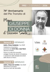 Il 2 Gennaio ricorre il 74 mo anniversario del pio Transito del Venerabile Mons. Di Donna, in questa occasione ci sarà una Celebrazione Eucaristica in Cattedrale alle ore 18.30 presieduta da Mons. Giuseppe Favale Vescovo della Diocesi di Conversano – Monopoli, e concelebrata dal Vescovo di Andria Mons. Luigi Mansi e dai sacerdoti. Come da consuetudine presso la tomba del venerabile ci sarà anche l’omaggio floreale dei fedeli di Rutigliano e l’accensione della lampada da parte dei devoti della Diocesi di Andria. Venerdì 9 gennaio invece presso la Chiesa del Carmine in Andria, alle ore 20.00 ci sarà l’Adorazione Eucaristica con i testi del venerabile.