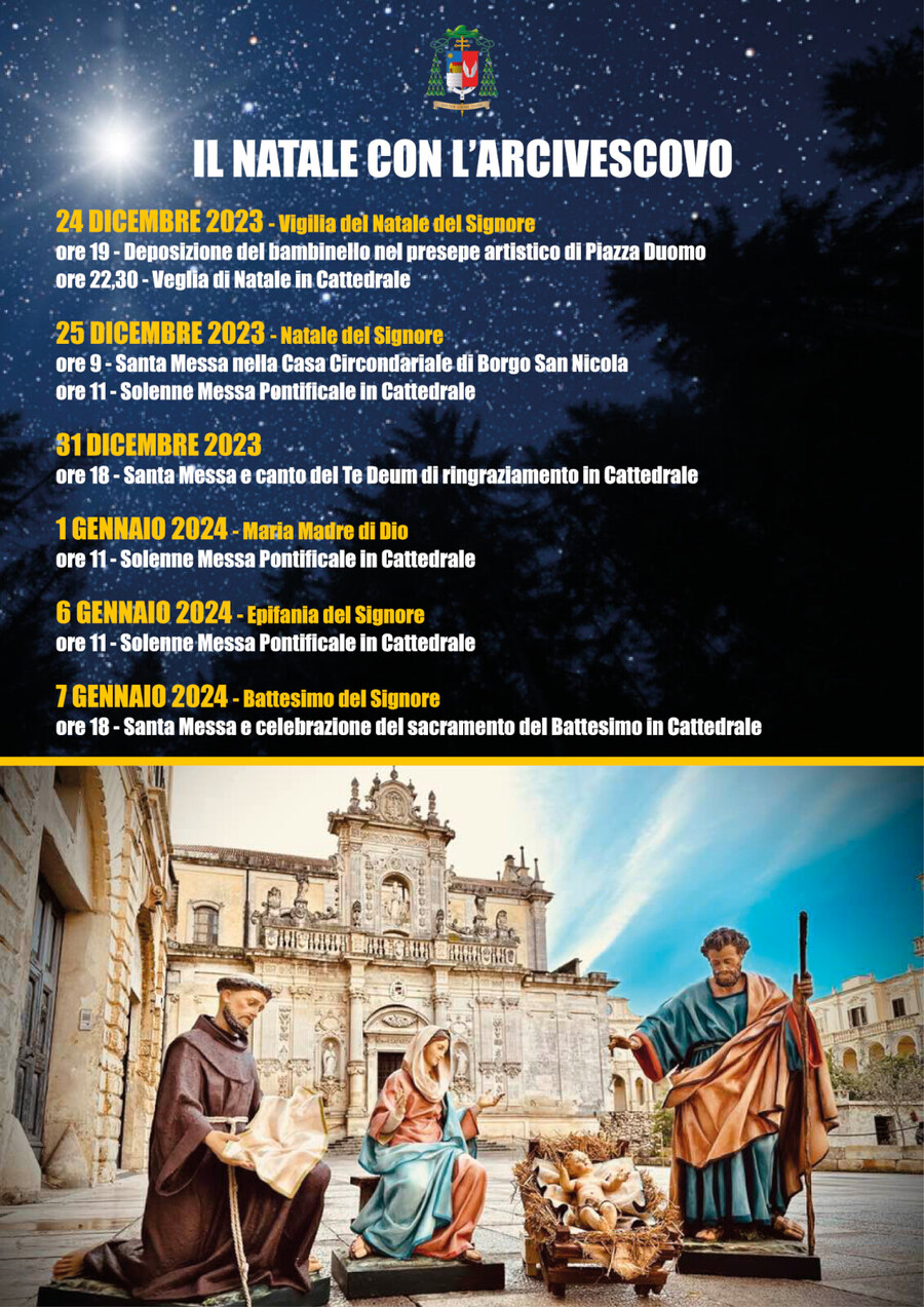 L’ultimo il 7 gennaio alle 18, dove nella chiesa madre della diocesi, mons. Seccia nella domenica del Battesimo del Signore, amministrerà il primo dei sacramenti ai bambini, rendendoli figli di Dio e incorporandoli alla grande famiglia della Chiesa.