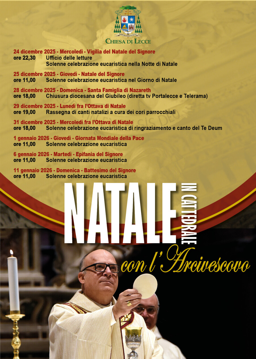 Il 6 gennaio, solennità dell’Epifania del Signore e l’11 gennaio Festa del Battesimo del Signore la solenne celebrazione presieduta dal pastore della Chiesa di Lecce alle 11 sempre nella chiesa cattedrale.