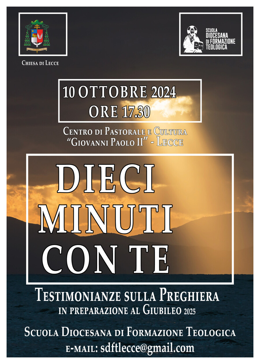 In vista dell’incontro-testimonianza sulla preghiera “Dieci minuti con te”, promosso dalla Scuola diocesana di formazione teologica diretta da mons. Piero Quarta, in programma giovedì 10 ottobre alle 17,30 presso il Centro di pastorale e cultura “Giovanni Paolo II”, Suor Luciana Mele, monaca della comunità claustrale benedettina di Lecce propone una riflessione ai lettori di Portalecce.