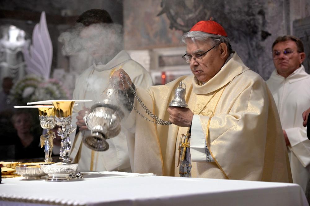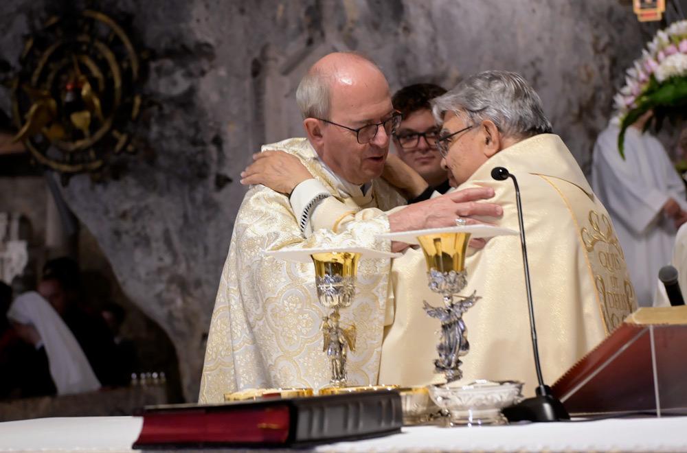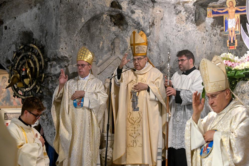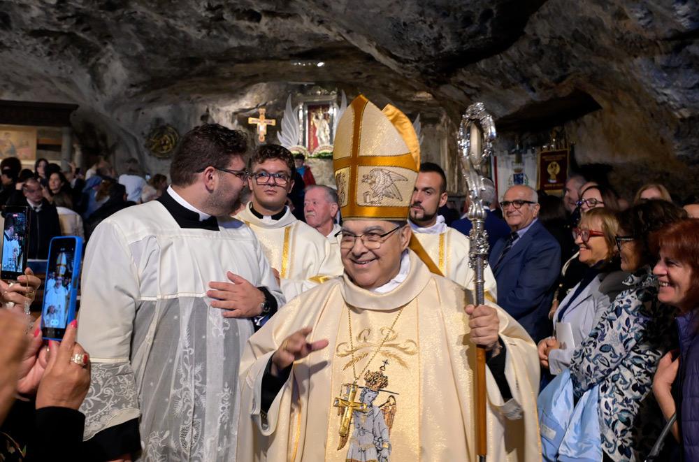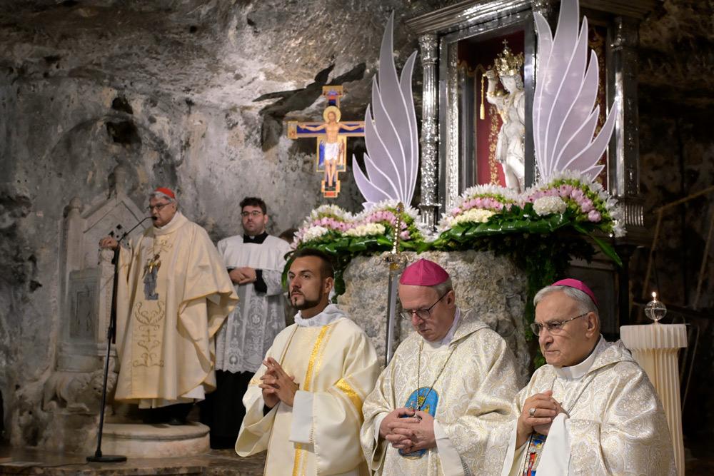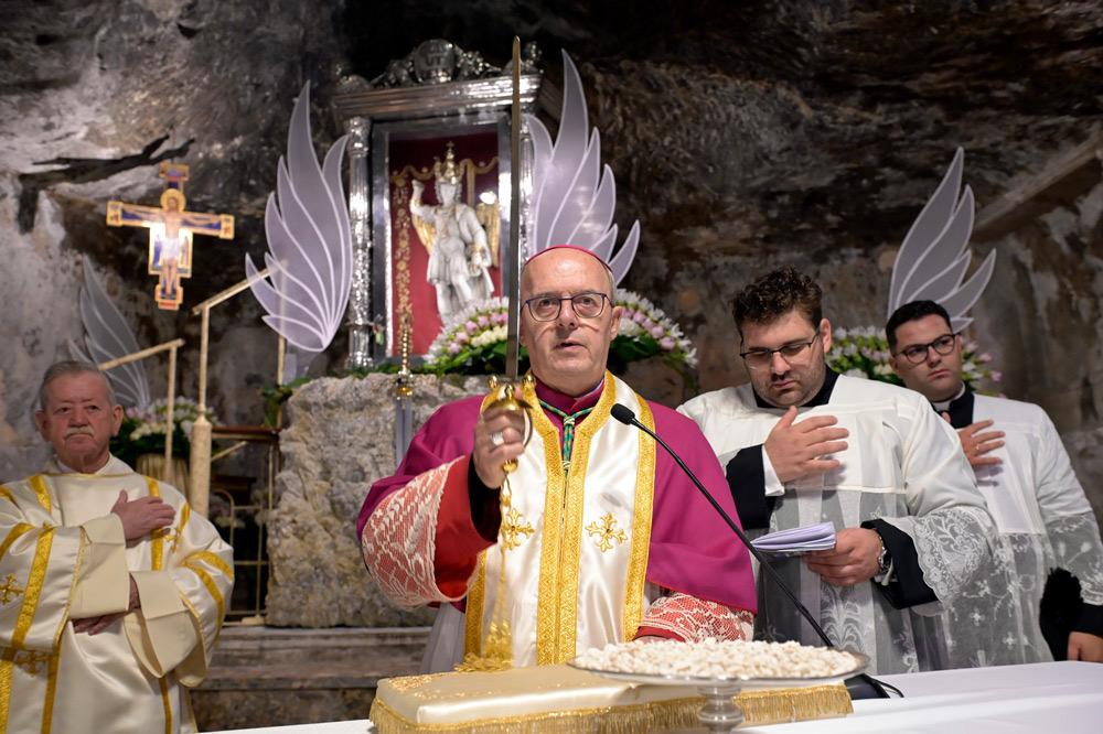 Giungo con devozione grande in questo antico Santuario dove l’arcangelo Michele è, fin dai primi secoli della storia cristiana, particolarmente venerato . Nella tradizione biblica Michele è indicato come colui custodisce il popolo di Dio (cf. Dan 10,13; 12,1) e, in quella cristiana, è, come diceva San Gregorio Magno, l’Arcangelo che «con la sua preghiera ci accompagna verso il Regno dei Cieli» (Liber responsalis, 825: PL 78, 805). La missione affidata da Dio agli Angeli è davvero questa: essere come degli intermediari, che portano a Dio le preghiere e le umane invocazioni rendendole efficaci con la loro intercessione e quindi portano a noi l’aiuto del Signore (cf. San Bernardo, In Cantica 31, 5: PL 183, 943). Eccomi, allora, qui per celebrare con tutti voi l’Eucaristia in un luogo dove tante volte e in tanti modi è stata sperimentata e si ottiene la misericordia di Dio. È un santuario, questo, che la tradizione micaelica intende come un particolare dono Dio: non è stato scelto dagli uomini, ma lo ha scelto Dio stesso per rimettere i peccati degli uomini.